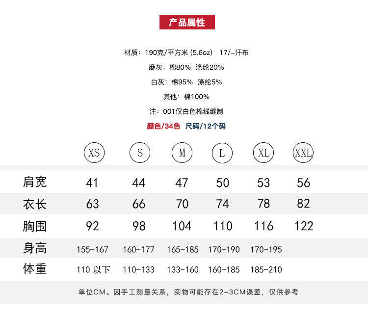 190G Printstar纯棉黑白短袖T恤男女半袖纯色圆领T恤基础款
